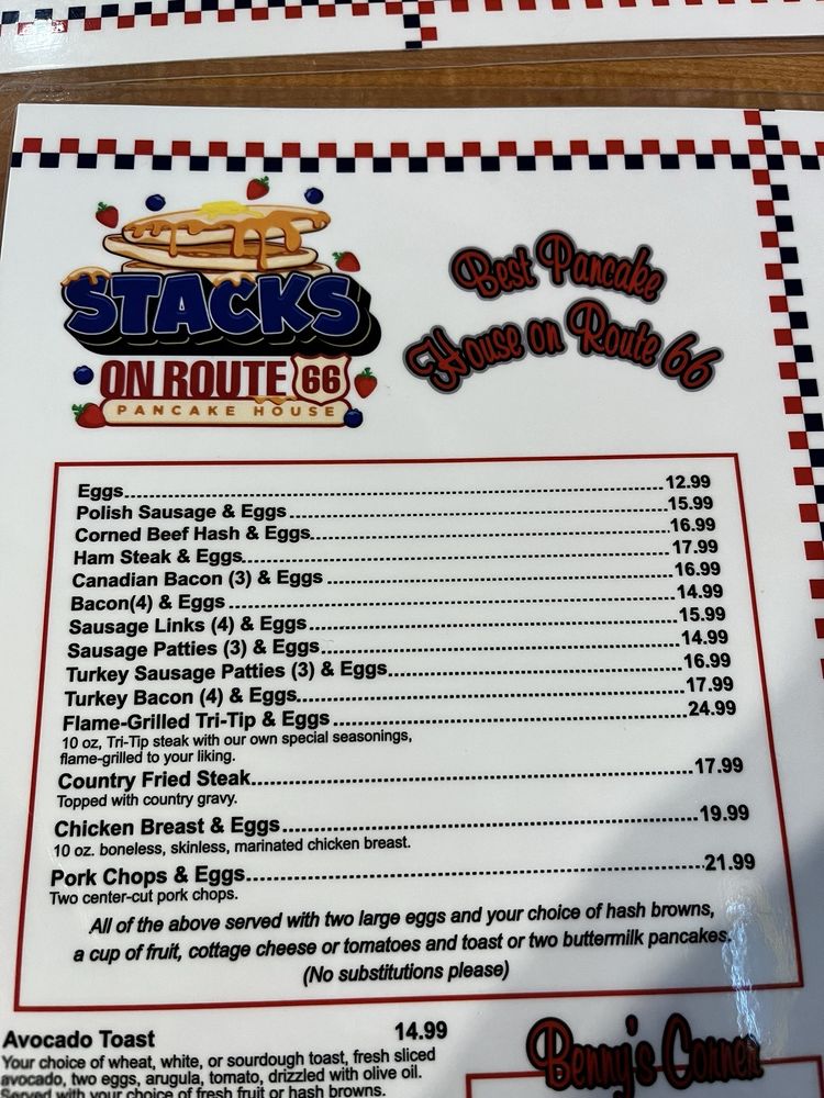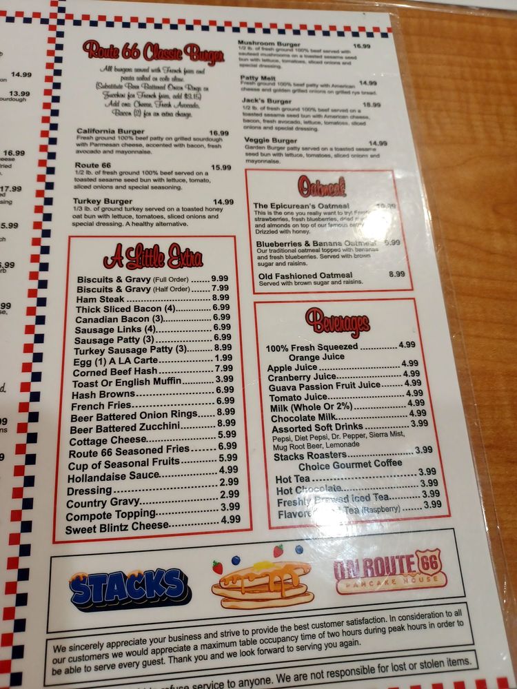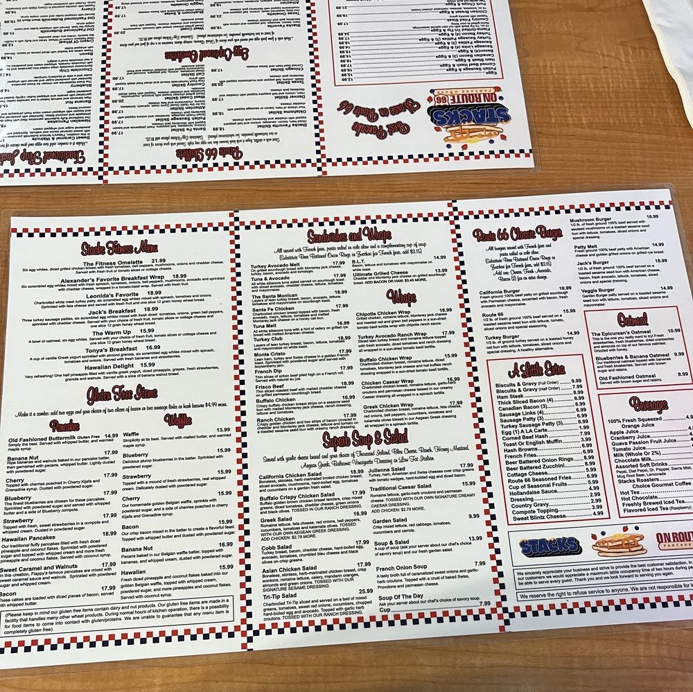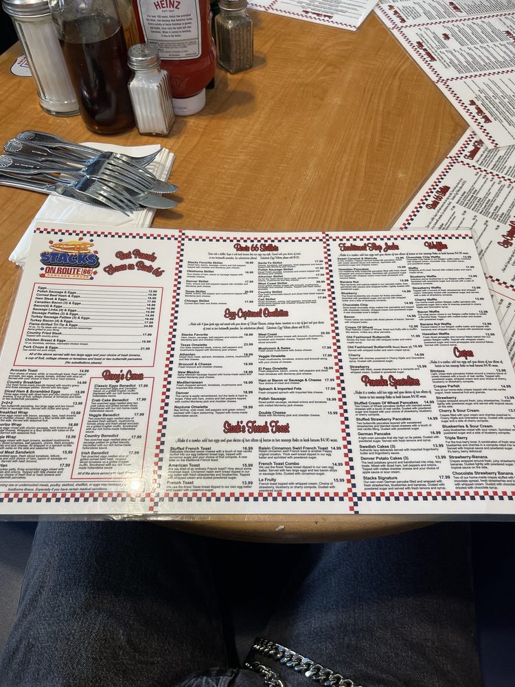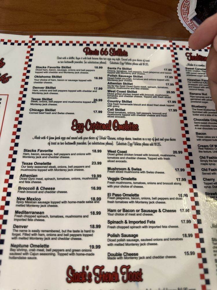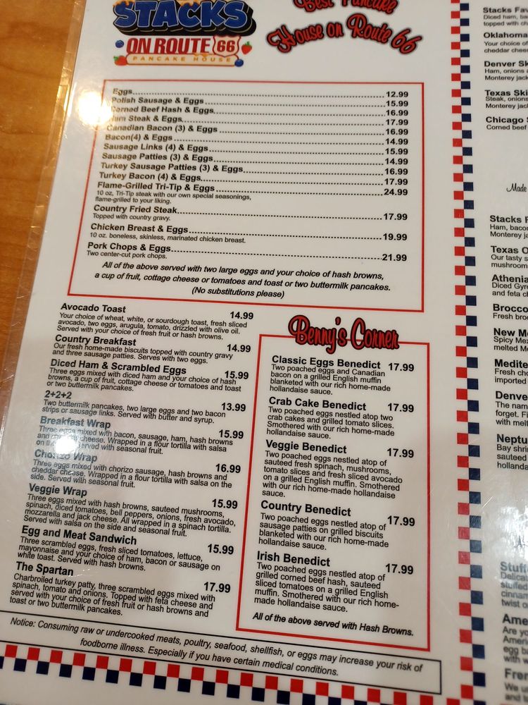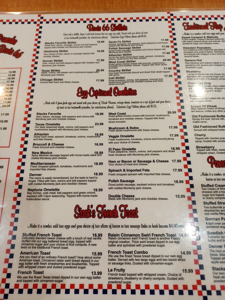 Introducing Stacks On Route 66, a diner that promises fresh and delicious food in a warm and welcoming atmosphere. Located at 640 W Rte 66 Glendora, CA, this restaurant offers a wide range of breakfast options, including skillets like the Athenian Skillet packed with diced Gyro meat and feta cheese. Customers rave about the Texas Skillet loaded with steak, crispy hash browns, veggies, and cheese. The ambiance is praised as fantastic, with friendly service and ample seating options. Dishes like the Polish Skillet and Denver Omelet impress with generous portions and flavorful ingredients. Overall, Stacks On Route 66 is a breakfast gem that never disappoints, offering a delightful dining experience for all.